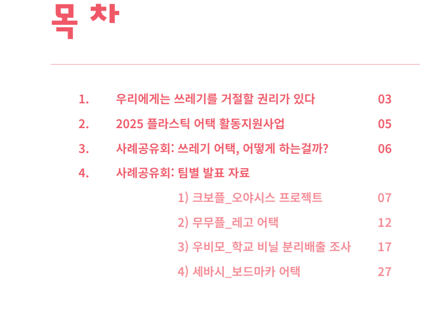 이렇게 멋진 활동을 펼친 쓰레기 덕후들, 이들을 조직하고 받쳐준 서울환경연합, 그리고 재원을 지원한 아름다운 가게에 감사드립니다. 더 많은 플라스틱 어택이 계속되기를. 쭈욱 계속되기를 기원합니다.