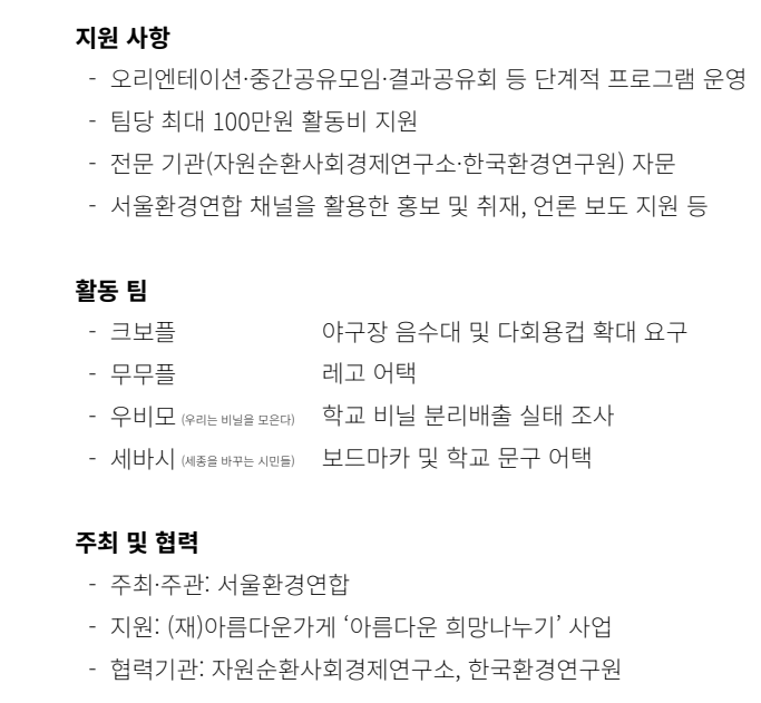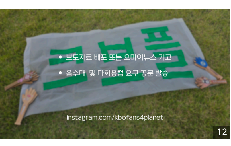 현황을 파악한 후 오픈마이크, 오마이뉴스 글 기고, 서명 운동을 통해 음수대 설치와 다회용컵 사용을 촉구하는 등 다방면으로 활동하였습니다. 제발 야구경기장은 크보플의 플라스틱 어택에 응답하라!