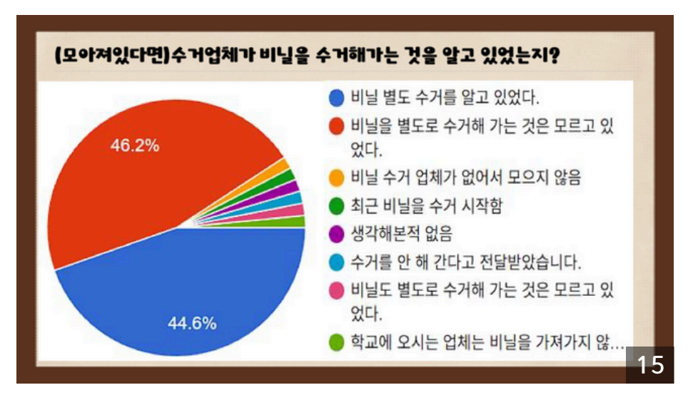 실태를 확인하기 위해 설문조사를 진행한 결과 교실에서 비닐류를 따로 분리하지 않는 경우가 50% 이상을 차지했습니다. 또한 학교 구성원들은 비닐을 따로 배출하는지 모르는 경우도 약 절반이나 되었습니다.