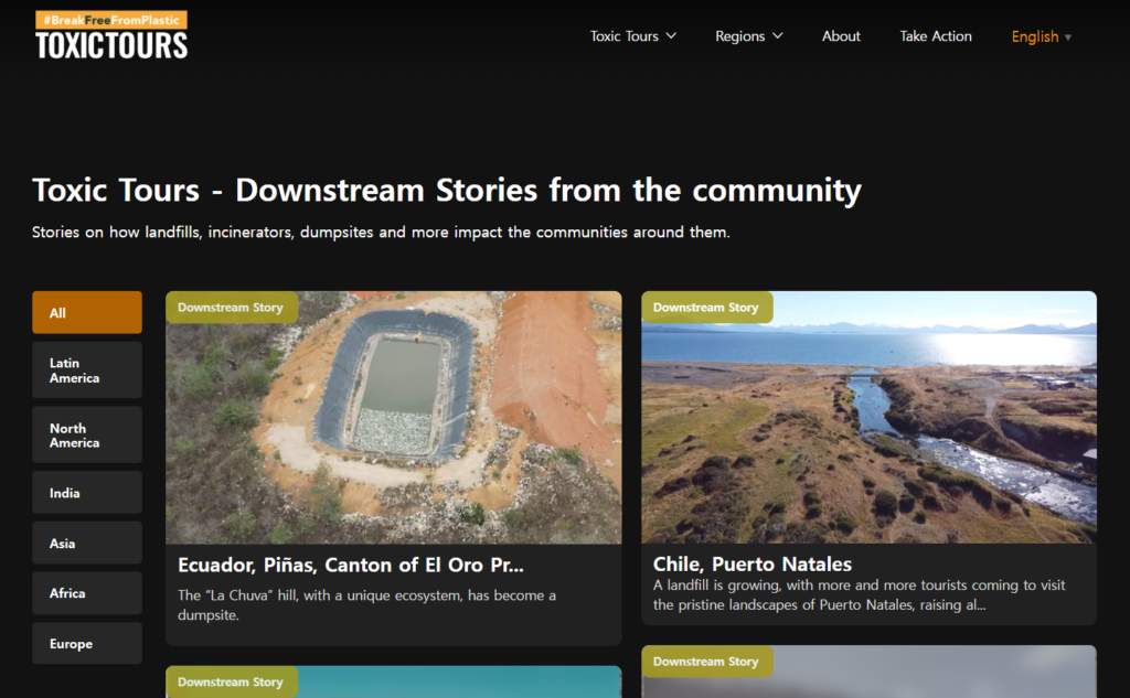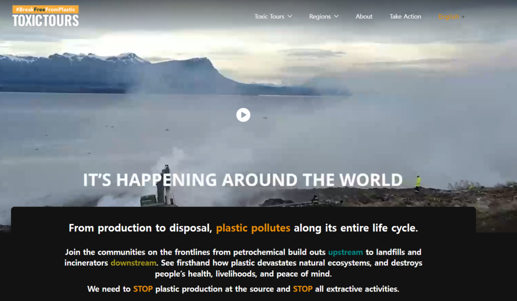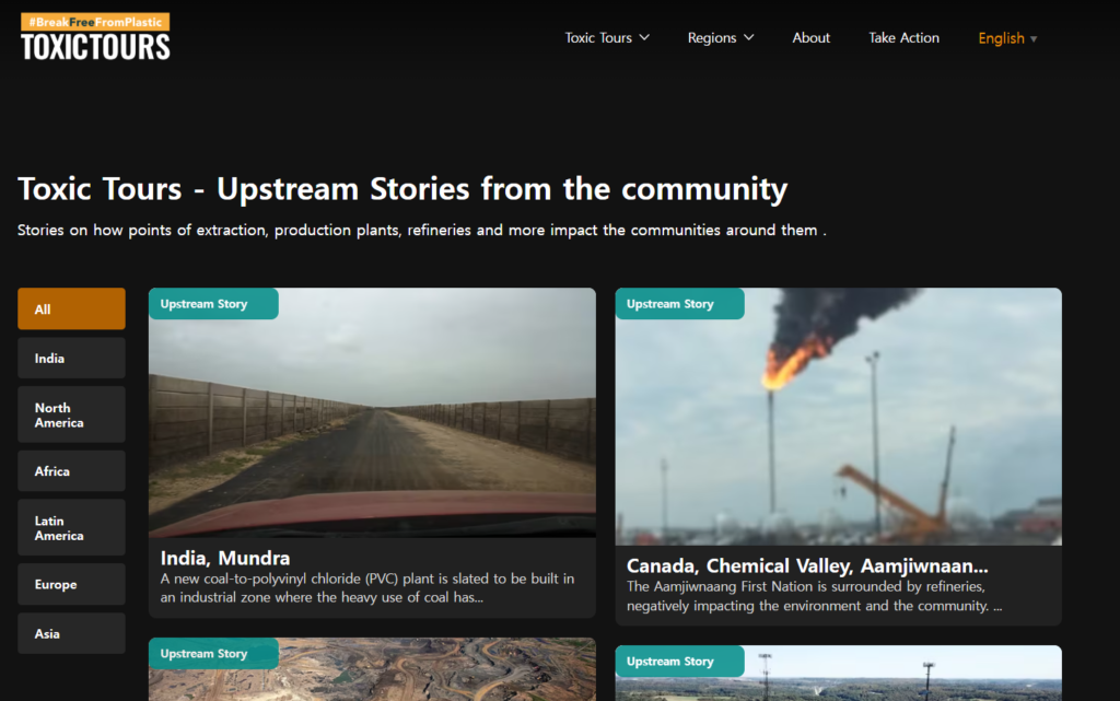 BFFP에서 ‘톡식투어’라는 플라스틱 생산과 폐기 과정에서 환경이 얼마나 오염되는지 보여주는 전 세계 곳곳을 영상으로 모아두었습니다.