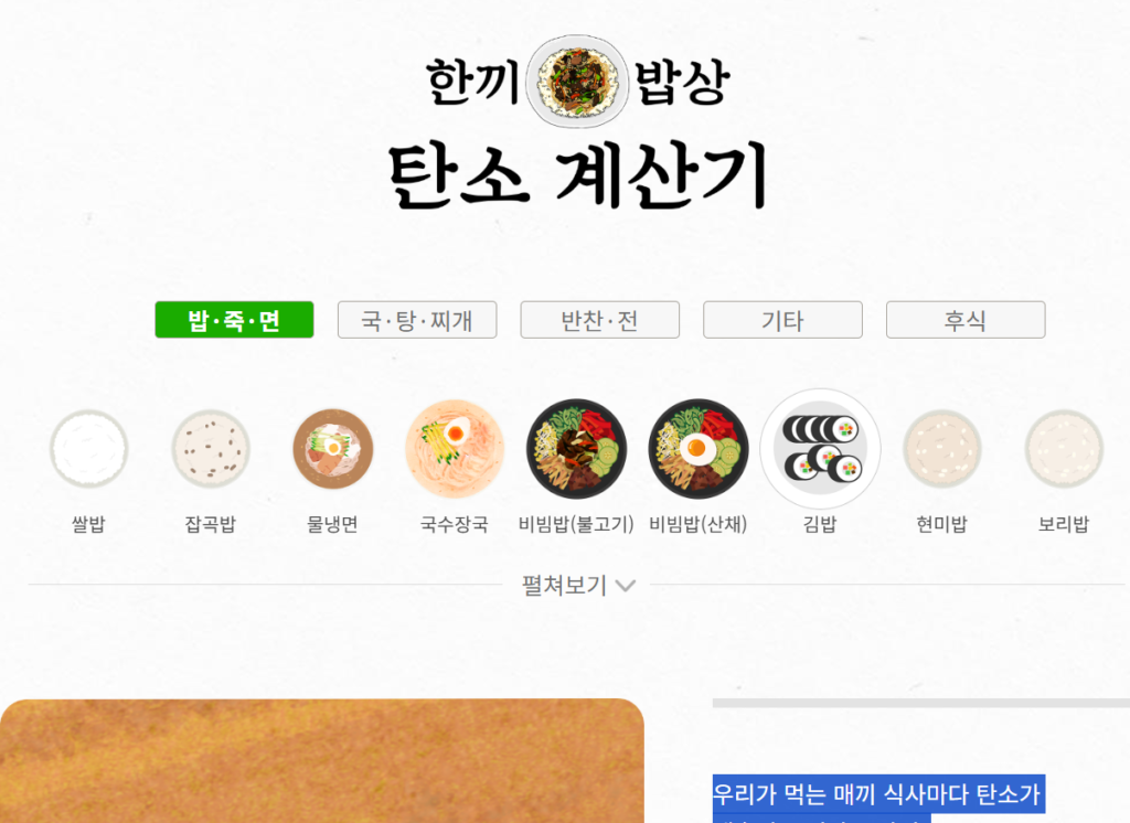 내가 먹을 한끼 밥상을 차리면서 탄소 배출량을 확인하세요!