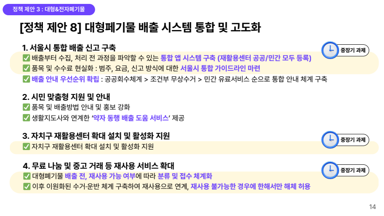 현재 대형폐기물은 각 자치구별로 신고 절차와 수수료 체계가 상이하여 접근성이 낮고, 품목의 다양성과배출 방식의 복잡성으로 인해 시민들의 혼란이 큰 품목 중 하나이다. 그렇기에 대형폐기물 배출 체계의 효율화가 가장 큰 과제이다.