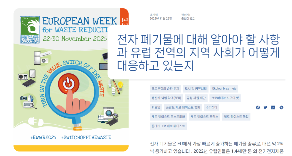유럽 ​​전역에서 사람들은 실용적이고 지역사회 기반의 해결책이 이미 존재함을 보여주고 있습니다. 유럽 폐기물 감축 주간(EWWR)은 공공 기관, NGO, 학교, 기업 및 시민들을 한자리에 모아 폐기물을 줄이는 실질적인 행동을 장려합니다. 올해는 전자 폐기물에 초점을 맞춰 지역 차원의 노력이 어떻게 측정 가능한 성과를 가져올 수 있는지 보여줍니다.