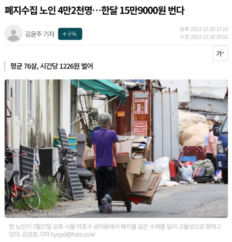 드디어 ‘폐지 줍는 어르신’ (자원재생수거인) 에 대한 보건복지부의 공식적인 조사결과가 나왔습니다. 실은 이분들에 대한 제대로 된 통계도 없던 실정이었어요. 결과는 예상과 다르지 않았고, 우리의 ‘골목 재활용’을 도맡아준 분들에 대한 예우에 한참 모자르네요. 폐지를 수거해 파는 노인 나이는 평균 76살이었다. 혼자(36.4%)…