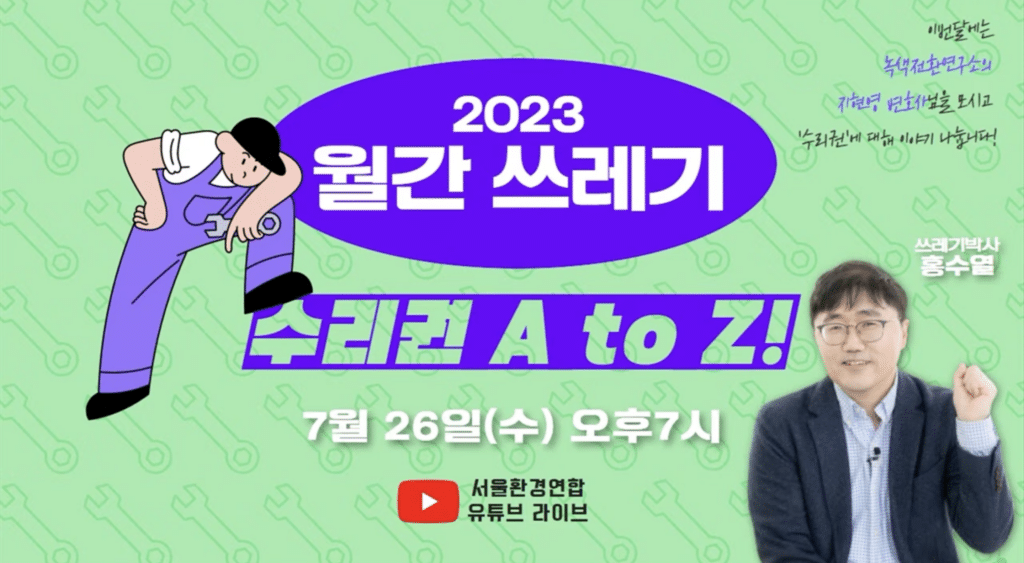 조금은 생소한 ‘수리권’! 🧐 수리권은 ‘수리에 대한 권리’를 의미합니다. 아끼는 물건이 고장 났는데 부품이 없어서 수리를 못했던 경험, 한 번쯤은 있을 겁니다. 😫 그래서 소비자들은 외치게 되었어요, “수리할 권리를 보장하라!” 아직은 알쏭달쏭한 수리권에 대한 이야기를 7월 월간쓰레기에서 녹색전환연구소의 지현영 변호사님과 함께 차근차근 알아보아요!😎 – 수리할 권리, 수리권 수리할 권리, 수리권이 무엇인가요? 최근 전자기기 관련 소비자들의 […]